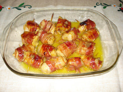 fatias de bacon e espete um palito para ficar bem aconchegado.